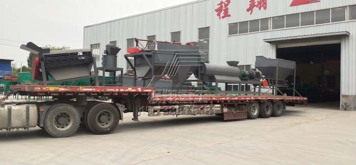 查看 > 20 2020/11由于該豬糞秸稈有機(jī)肥料生產(chǎn)線產(chǎn)量較大,因此分為多車裝置運(yùn)輸。主要的豬糞加工設(shè)備有:大型秸稈粉碎機(jī)、履帶式翻堆機(jī)、臥式攪拌機(jī)、新型三合一造粒機(jī)、不同型號的滾筒篩分機(jī)以及多個型號的烘干冷卻設(shè)備。滾筒烘干設(shè)備風(fēng)頭以及風(fēng)機(jī)安置熱風(fēng)爐以及冷卻設(shè)備多個烘干冷卻設(shè)備履帶式翻堆機(jī)以及大型秸稈粉碎機(jī)二次烘干設(shè)備滾筒篩分機(jī)以及鏟車喂料倉本次豬糞秸稈有機(jī)肥料生產(chǎn)線工藝設(shè)計流程為:利用大型秸稈粉碎機(jī)將稻草秸稈等粉碎均勻,
