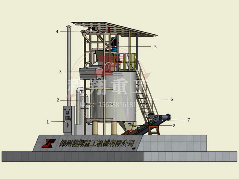 上圖為:有機(jī)肥好氧立式發(fā)酵罐。1-配電柜,2-光氧除臭設(shè)備,3-上料斗,4-提升滾輪,5-電機(jī),6-樓梯,7-移動(dòng)皮帶輸送機(jī),8-下料口