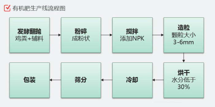 禽畜糞便預(yù)處理——接種(加入菌劑)——堆積發(fā)酵——翻堆(翻板)——繼續(xù)發(fā)酵——卸料——后處理(晾干——粉碎——分篩去雜——檢測——包裝——成品)——有機肥。下圖該雞糞生產(chǎn)線為標(biāo)準(zhǔn)的小型有機肥生產(chǎn)線工藝,其中需要用到的有機肥加工設(shè)備有:履帶式翻堆機、有機肥半濕物料粉碎機、臥式攪拌機、雞糞造粒機、滾筒烘干機、滾筒篩分機、自動包裝秤等等。
