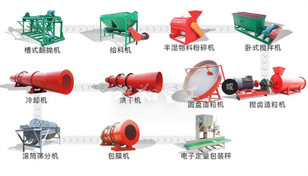 生產復混肥主要包含兩個環(huán)節(jié):發(fā)酵及造粒。發(fā)酵期間主要借助有機肥槽式翻堆機以及有機肥粉碎設備,后期造粒環(huán)節(jié)主要有臥式攪拌機、濕法造粒機、滾筒篩分機以及包裝秤等等,有需要的可以添一些常用的有機肥加工配套設備:滾筒烘干機、冷卻機、以及包膜機等等。