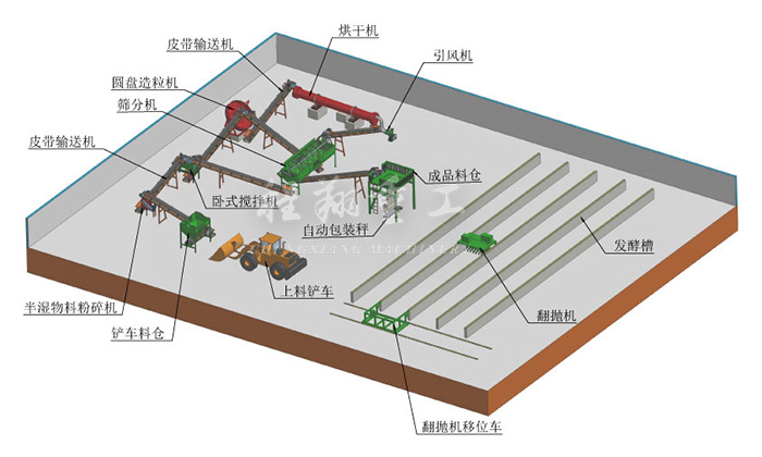 本次牛糞全套有機(jī)肥料設(shè)備生產(chǎn)工藝采用槽式好氧發(fā)酵,利用翻堆槽發(fā)酵既干凈又能最大化的利用有限的場地,增加糞便處理量。由于客戶對于顆粒有機(jī)質(zhì)含量以及NPK有特殊要求,因此我們?yōu)榭蛻魧iT定制了一臺(tái)三倉的靜態(tài)配料系統(tǒng)。