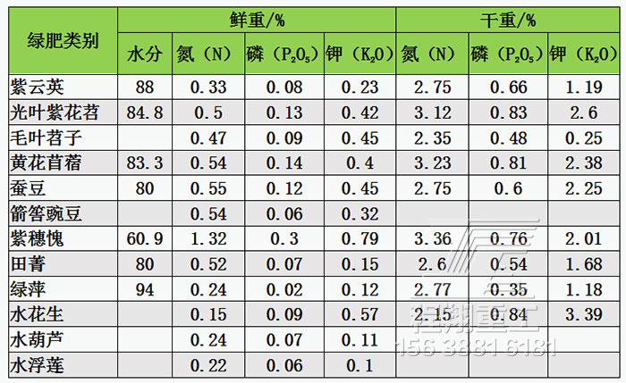 綠肥的養(yǎng)分含量 主要的綠肥種類有紫云英、苕子、紫花苜蓿、草木犀等。其養(yǎng)分含量堿表1。