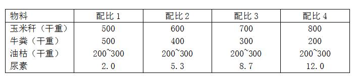 主要選擇資源豐富的軟質(zhì)作物秸稈和畜禽糞便為主,將物料的C/N比值盡可能調(diào)節(jié)到25:1。根據(jù)各地原料的差異,選擇下表中所列物料配比中的一種(其他秸稈和畜禽糞便可參照該比例)。油枯應發(fā)酵結束前10 d左右按比例添加,均勻鋪在發(fā)酵堆上,通過利用臥式粉碎機將油枯與其他物料攪拌均勻,使用槽式翻堆機再堆制發(fā)酵。若加入油枯后堆溫超過60℃,應即時翻堆,防止油枯炭化和氨化。