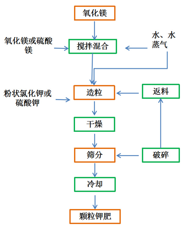2、將粉狀氯化鉀或硫酸鉀加入轉股造粒機或圓盤造粒機中,按比例噴灑以干基計的質量分數(shù)為0.5%-10.0%的造粒添加劑---氯氧鎂水合物(或硫氧鎂水合物),同時通過蒸汽連續(xù)造粒成球,再經(jīng)干燥、冷卻、篩分,即可獲得顆粒鉀肥成品。